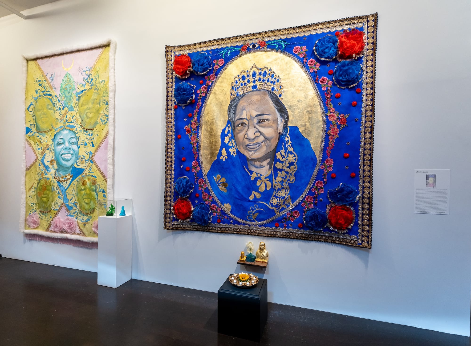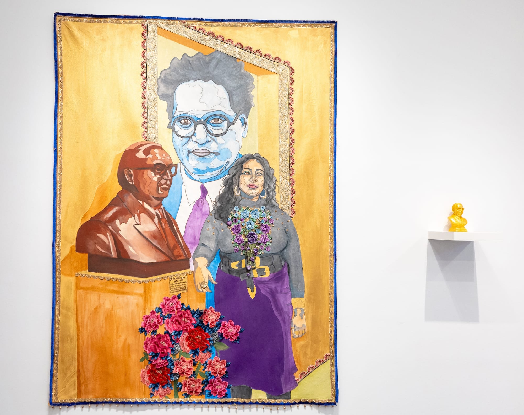 Pyaari Azaadi, "Yashica Dutt in the Age of Ambedkar" (2023), acrylic paint and fabric trims on canvas, beside a small bust of Ambedkar (image courtesy the artist and Pen and Brush)