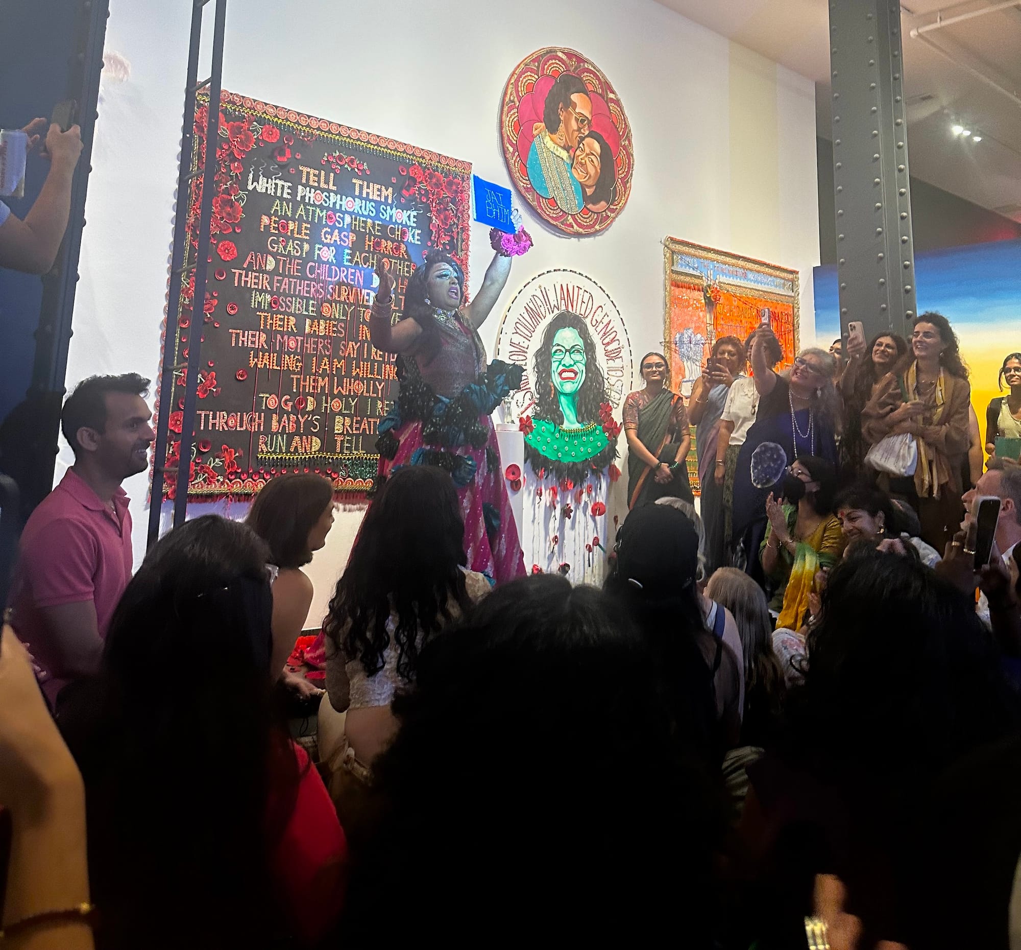 One section titled "Ancestors" features large-scale works honoring late artist Nona Faustine (left) and late doctor and Dalit activist Thilakavathy Soundararajan (right), mother of Equality Labs Founder Thenmozhi Soundararajan. (image courtesy the artist and Pen and Brush)Drag performance by LaWhore Vagistan — holding an artwork reading "Jai Bhim," an anti-caste greeting and affirmation of solidarity invoking the legacy of Ambedkar — at the packed exhibition opening on September 25 (photo Lakshmi Rivera Amin/Hyperallergic)Pyaari Azaadi, "The Alchemist (For Anantha)" (2021) (photo Lakshmi Rivera Amin/Hyperallergic)