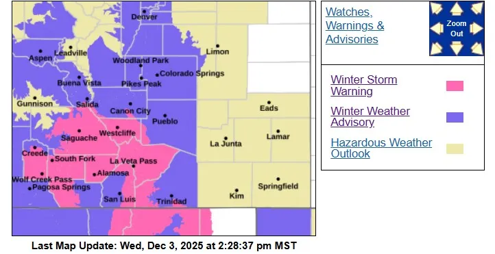Portions of Colorado, including Saguache County east of the Continental Divide below 10,000 feet, the Sangre de Cristo Mountains, the eastern San Juan Mountains above 10,000 feet, the Upper Rio Grande Valley, the eastern San Juan Mountains below 10,000 feet, the northern San Luis Valley, the central San Luis Valley, the Wet Mountains, the Wet Mountain Valley, the Walsenburg vicinity and the Upper Huerfano River basin below 7,500 feet, are under the warning, according to the NWS.