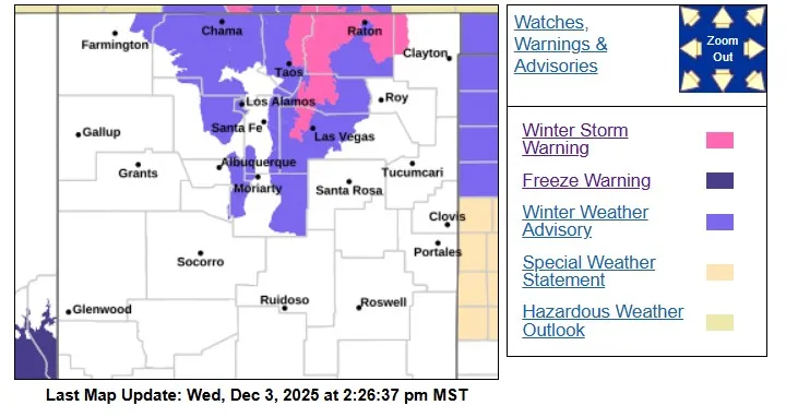 In New Mexico, the NWS said that the East Slopes Sangre de Cristo Mountains, Northern Sangre de Cristo Mountains and Johnson and Bartlett Mesas, including Raton Pass, are under the warning. Two to 13 inches could be possible under the warning, the NWS said.